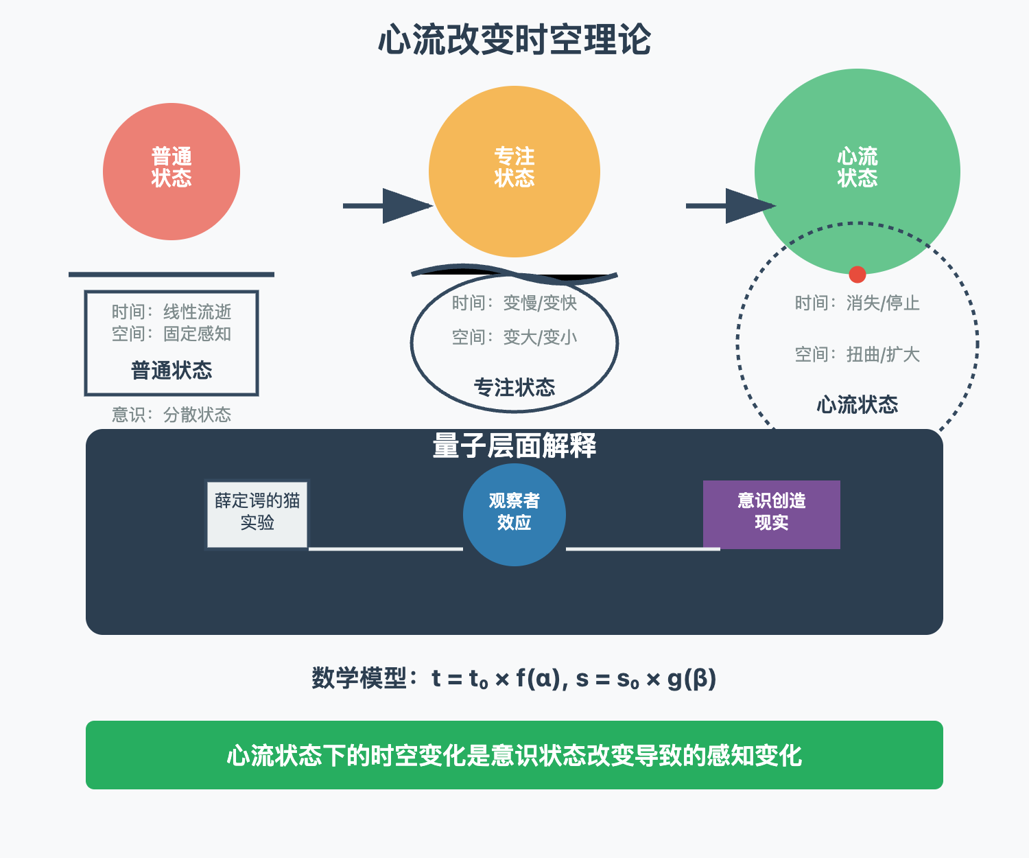 2. 心流改变时空理论:高品质心流状态下,时间和空间会发生根本性变化,这不是幻觉,而是意识状态的改变,呼应量子物理学的观察者效应。