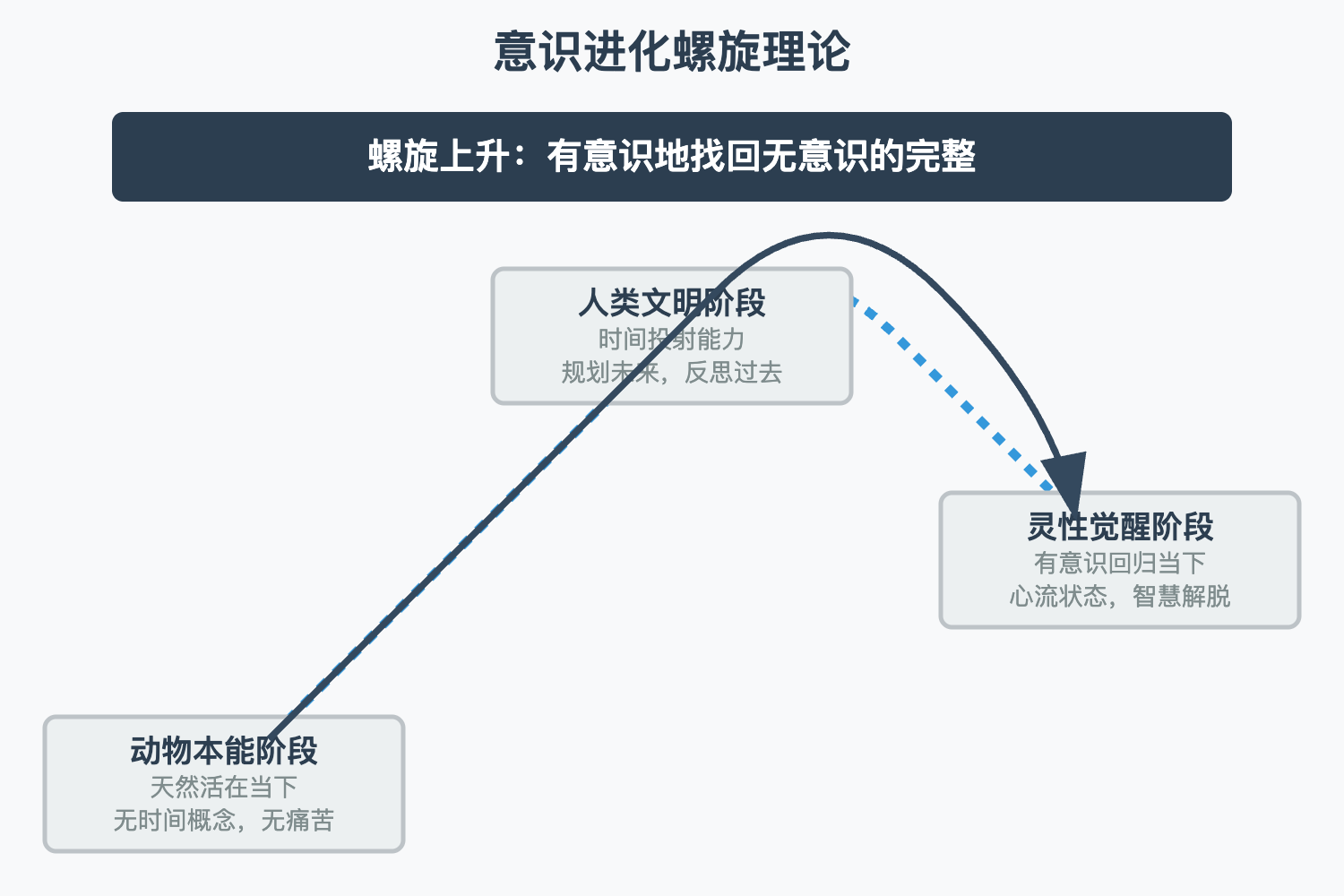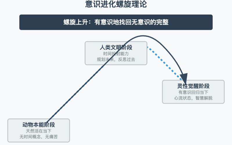 1. 意识进化螺旋理论:人类意识从动物本能(天然活在当下)→ 文明阶段(时间投射带来痛苦)→ 灵性觉醒(有意识回归当下)的螺旋式进化过程。